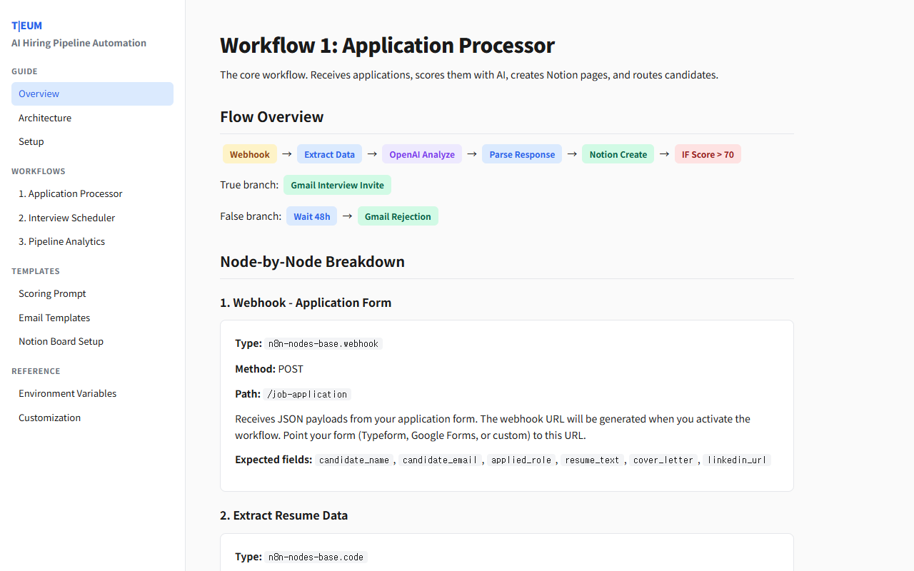 AI resume screening + scoring, Notion kanban board, interview scheduling, pipeline analytics. 3 n8n workflows.