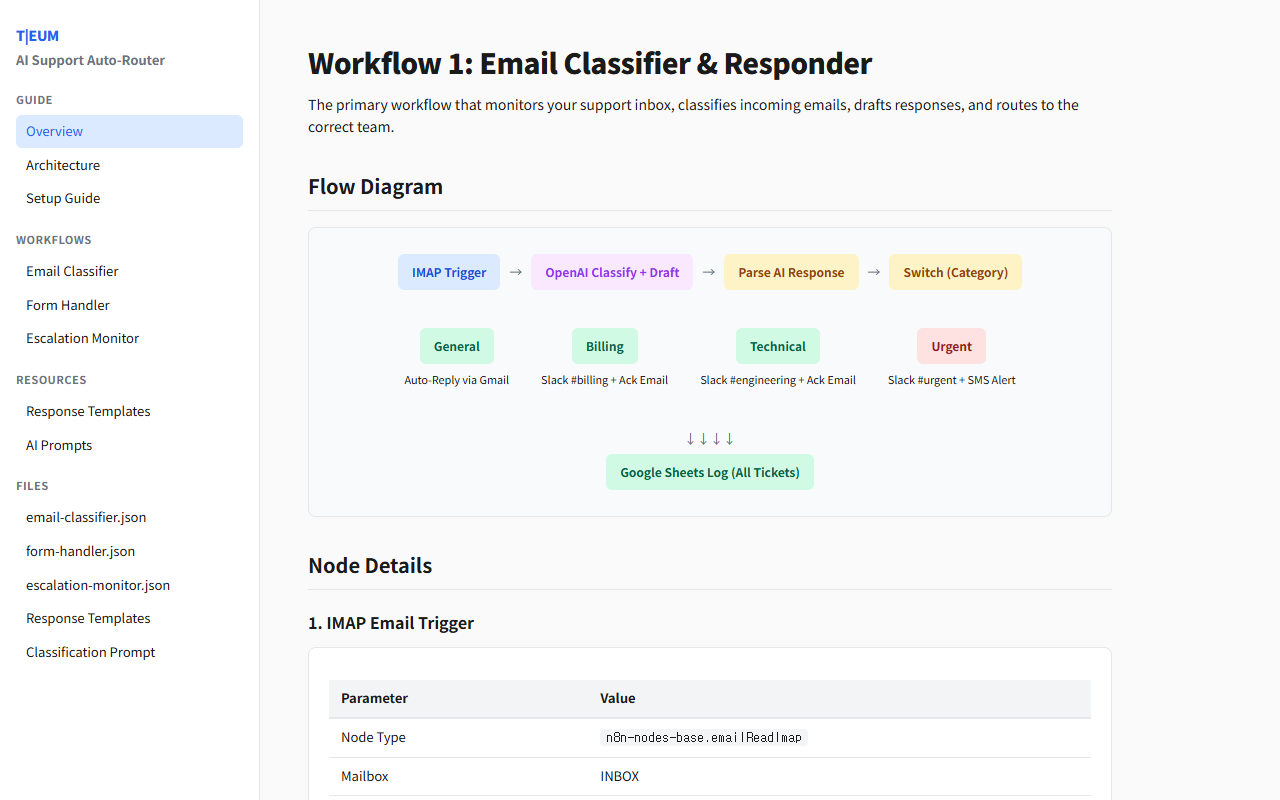 Auto-classify tickets (billing/technical/urgent), AI-draft responses, route to correct team, SLA monitoring. 3 n8n workflows.